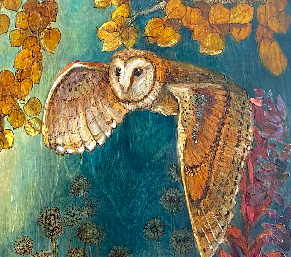 Over the past five years, I have developed a unique process I call, tinted woodburning. I begin  by burning the entire image into the surface of the wood using variety of marks to create patterns and textures. Once the image is complete, I then layer transparent pigments, with intervals of sanding, to bring out the unique grain of the wood and enrich the  image. Finally, I collage areas of the piece using handmade and printed papers, maps, and hidden images—this final touch accentuates the details of the image, bringing light, color, and a  bit of whimsy. The result of my tinted woodburning process is a truly one-of-a-kind piece utilizing a one-of-a-kind process.